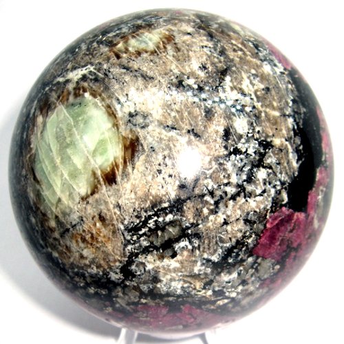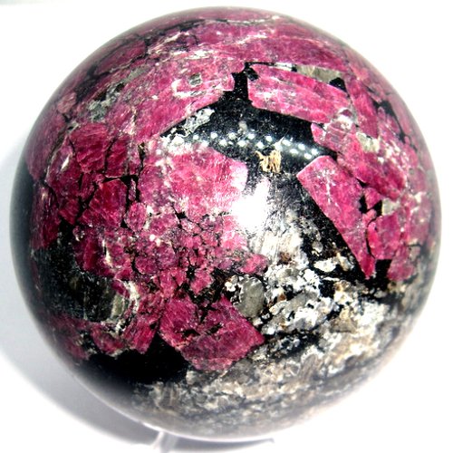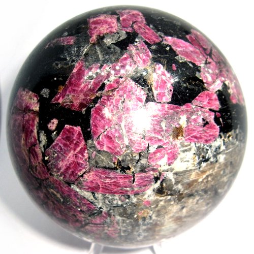This is the polished cherry eudialyte sphere. Diameter: 3.8″ (96mm). Weight – 3.1lbs (1394 grams). Origin: Russia, Kola Peninsula.