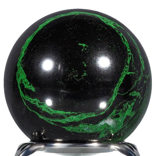This is the polished green uvarovite sphere with chromite. Diameter: 2.4″ (60mm). Weight – 14.9oz (422 grams). Origin: Russia, Ural.