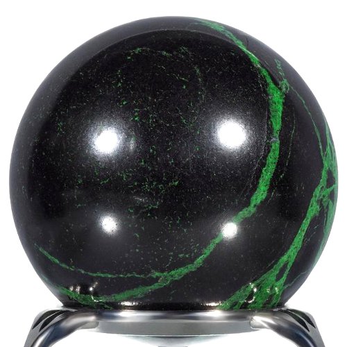 This is the polished green uvarovite sphere with chromite. Diameter: 2.2″ (56mm). Weight – 12.2oz (346 grams). Origin: Russia, Ural.
